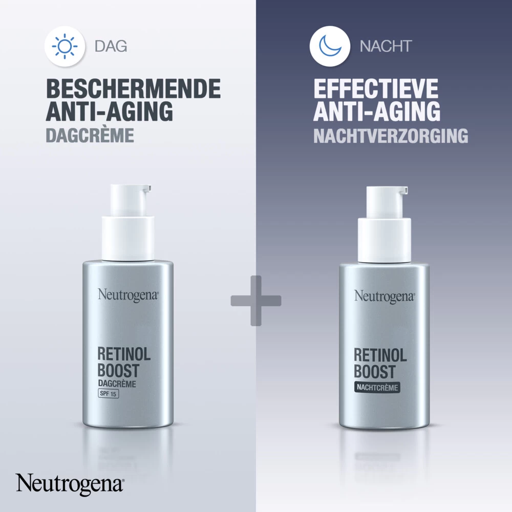 Neutrogena Retinol Boost Bundel Dagcrème en Nachtcrème Neutrogena Retinol Boost Bundel Dagcrème en Nachtcréme bestrijdt zichtbare tekenen van huidveroudering. Met deze bundel heb je in een keer je dag- en nachtverzorging in huis. Neutrogena Retinol Boost Dagcrème met zonbeschermingsfactor 15. De snel intrekkende Neutrogena Retinol Boost Nachtcrème met pomp doseert precies de juiste hoeveelheid voor de huid, geschikt voor alle huidtypen.Voor een jong