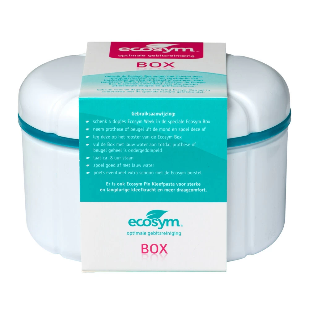 Ecosym Weekbehandeling GebitsbakjeEcosym Gebitsbakje is speciaal ontworpen voor de wekelijkse reiniging van uitneembare gebitsprothesen en beugels in combinatie met Ecosym Week Forte.Voor optimale reiniging van gebitsprothesen en beugelsVoor het verwijderen van hardnekkige aanslag zoals koffie, wijn en nicotineEenvoudig en makkelijkEcosym wordt aanbevolen door tandarts en tandtechnicus.