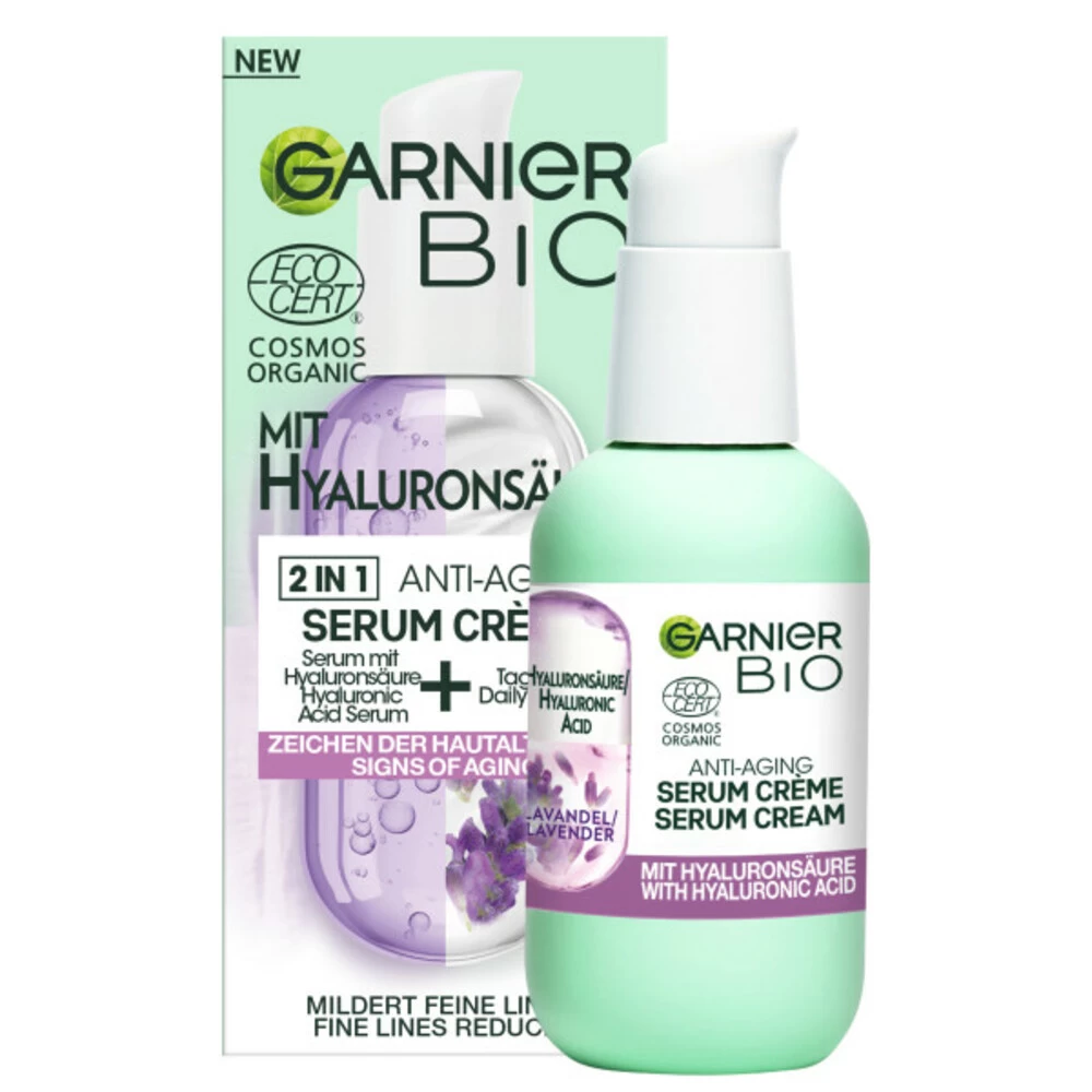 Garnier Bio Anti-Aging Serum Cream LavendelGarnier Bio Anti-Aging serum cream met Hyaluronzuur combineert de anti-aging eigenschappen van een serum met hyaluronzuur met de hydraterende werking van een dagcrème tegen fijne lijntjes. Dermatologisch getest en geschikt voor de gevoelige huid.Serum creamHyaluronzuurAnti-agingVermindert fijne lijntjes