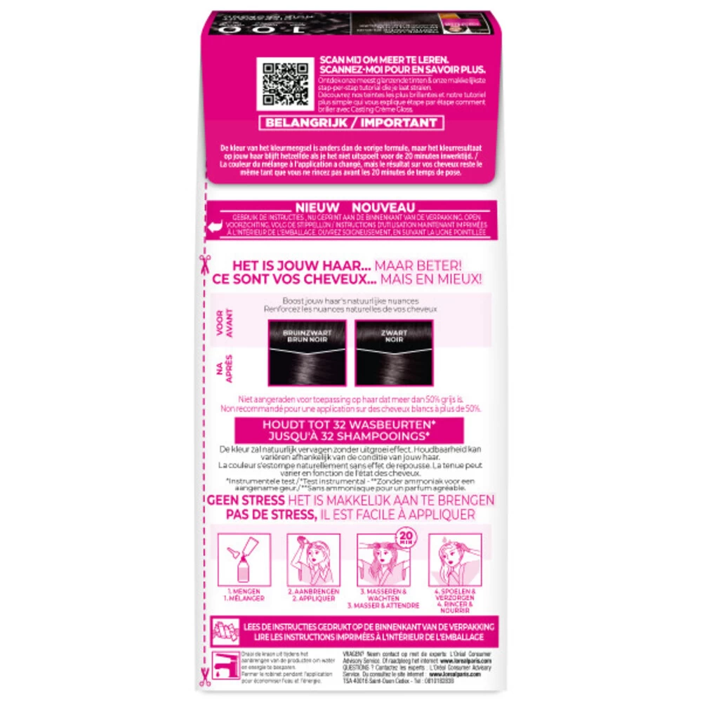 L’Oréal Paris Casting Crème Gloss 100 – Diepzwarte – Haarverf:- Semi-permanente haarkleuring zonder ammoniak voor een aangename geur- Stralende kleur, rijk aan nuances- Optimale dekking van grijze haren- Intense voeding: sterk en veerkrachtig haar- Semi-permanente kleuring: houdt tot 28 wasbeurtenCasting Crème Gloss is onze enige verzorgende semi-permanente crèmekleuring zonder ammoniak voor een subtiele kleurverandering. Een overvloed aan nuances brengt een rij