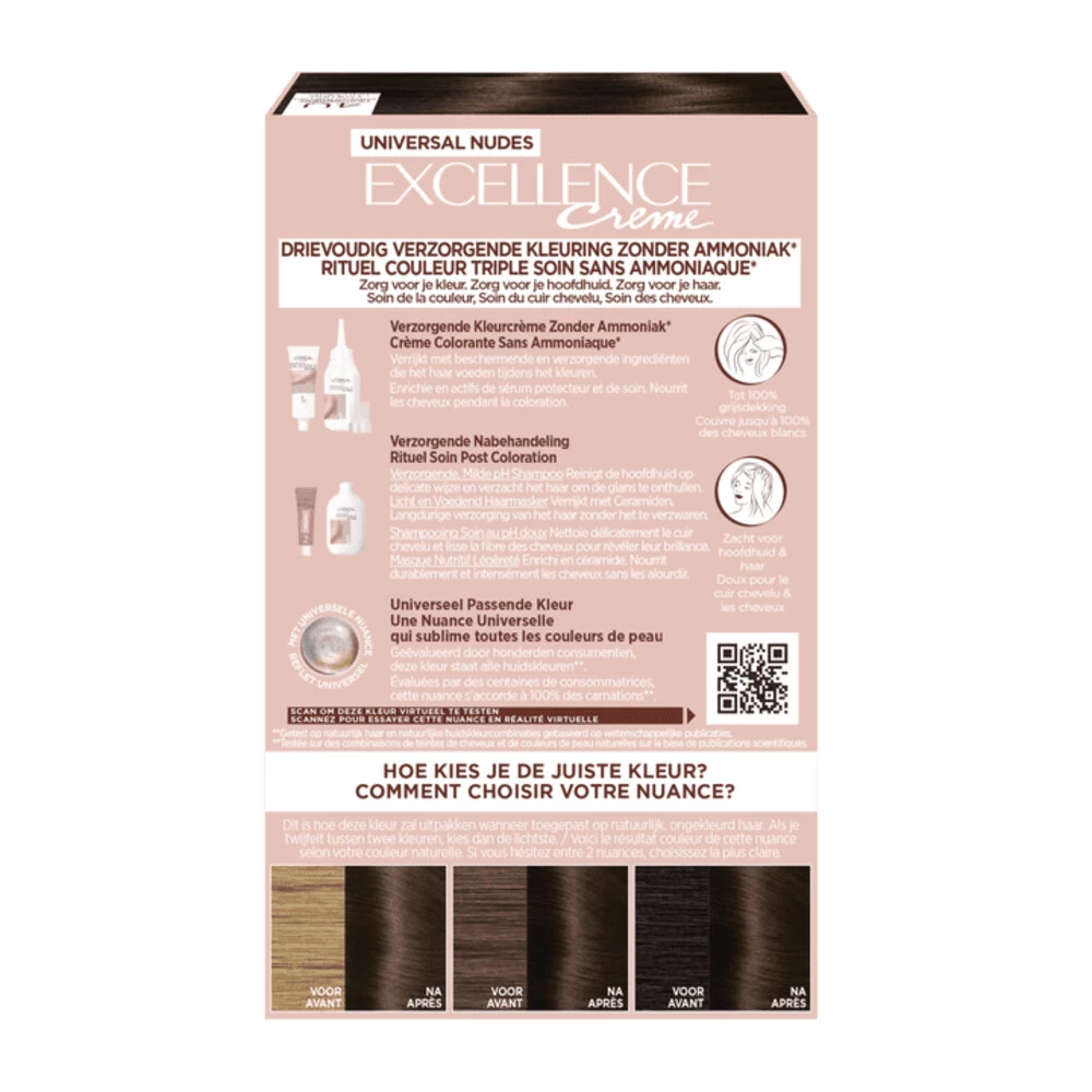Lu0027Oréal Excellence Creme Universal NudesL’Oréal Paris Excellence Crème Universal Nudes is een permanente haarverf zonder ammoniak die bij alle huidskleuren goed staat. De haarverf biedt tot 100% grijsdekking. De formule bevat de universele nuance U, een unieke samenstelling van koele en warme nuances voor een kleurresultaat dat bij alle huidskleuren staat en natuurlijk oogt. De nuance U is een combinatie van drie verschillende nuances: as, parelmoer en goud.Perman